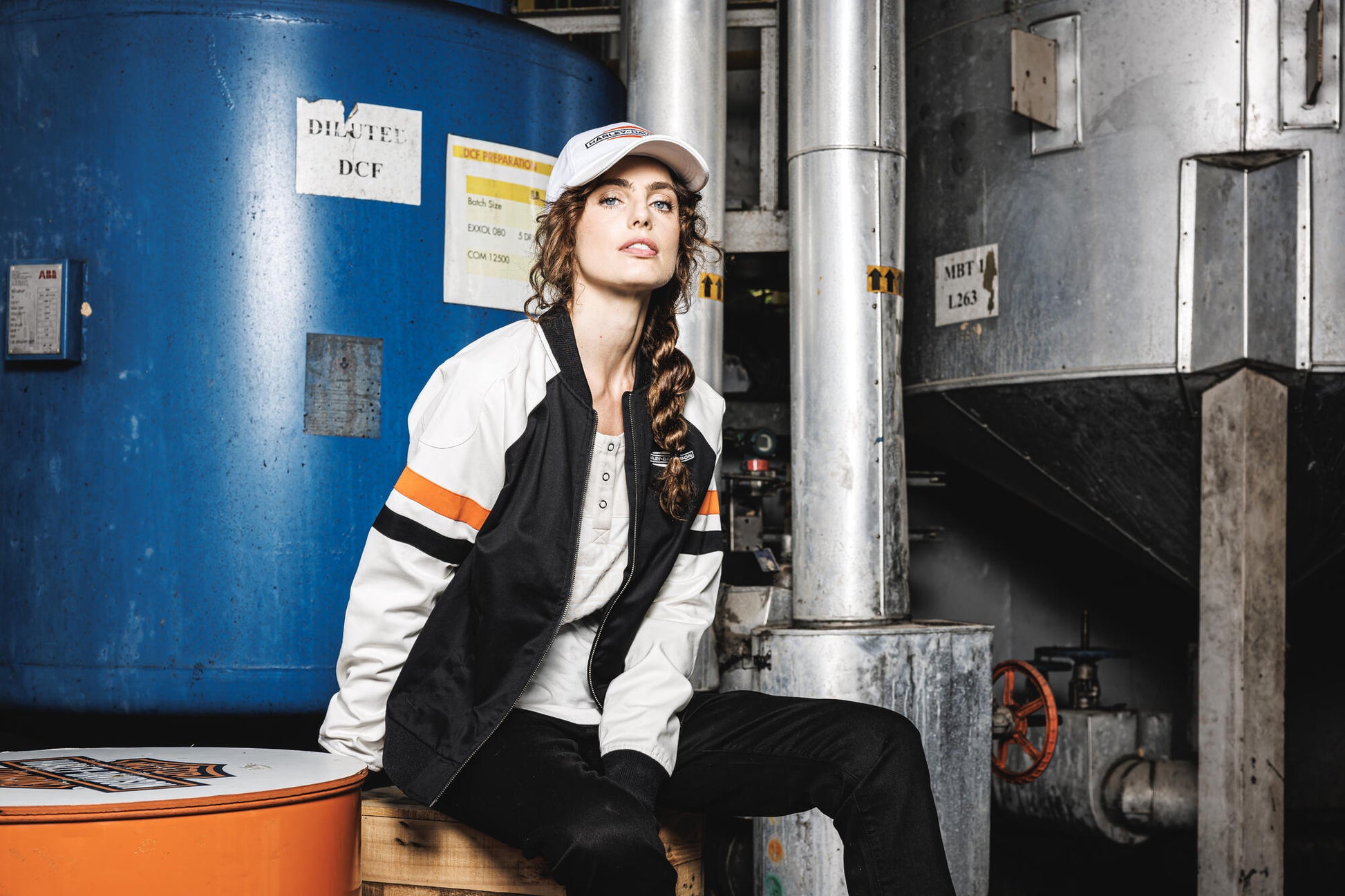 piecing. Top-applied sleeve striping. Rib-knit collar, cuffs, and waistband.