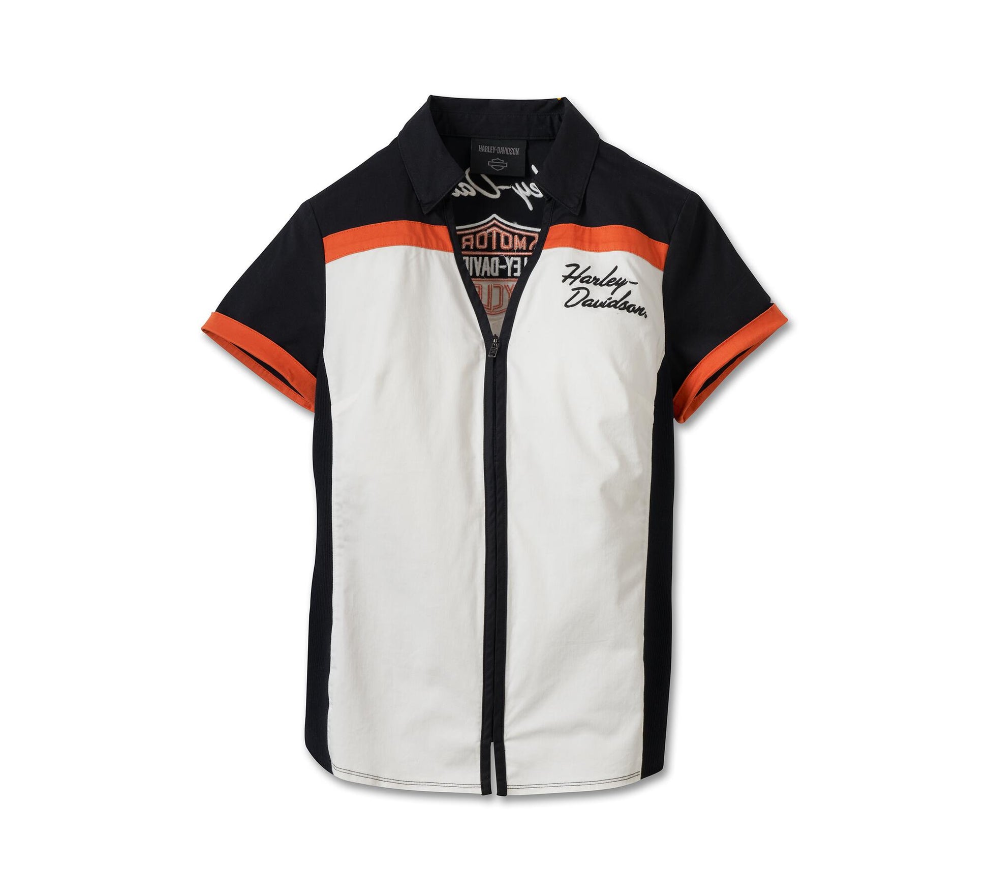 Retro lovers rejoice—this shirt embodies the look and motorcycle brand you love. Crafted from cotton with a hit of spandex twill for added stretch, our Elemental Bar & Shield Zip Front Shirt is washed for softness. It earns style points for details like its flattering neckline, contrasting yokes and chest piecing, princess seams, and cuffed sleeves. Its practical side features comfy rib-knit side panels and a hidden snap-down collar that stays put while you’re in the saddle. Our iconic Bar & Shield works in tandem with our scripted namesake to finish this women’s short sleeve shirt off in true Harley-Davidson style.