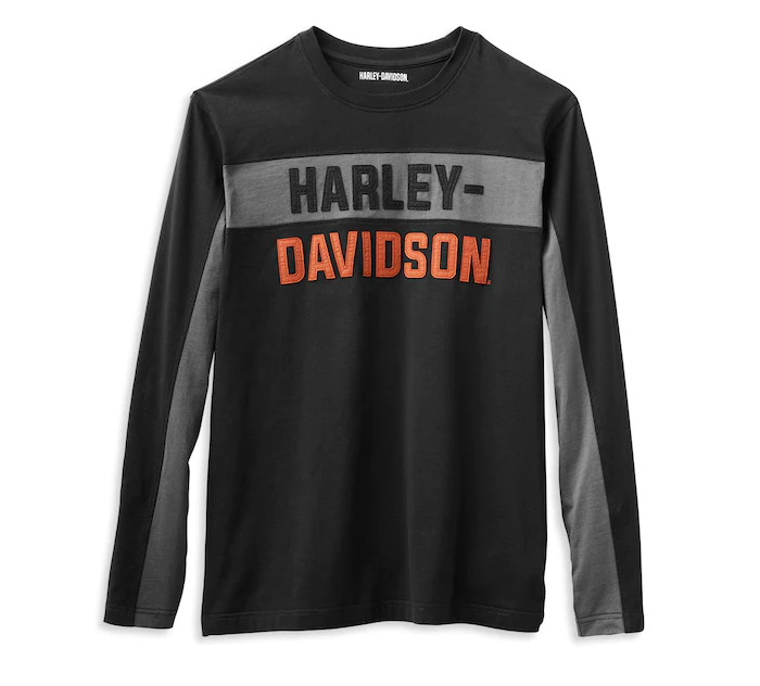 Subtle is overrated. Sport your enthusiast side big-time in this bold mix of branding, color, and texture. Made from soft 100% cotton jersey material in a style that holds its own or wears well under your favourite H-D flannel, vest, or jacket. Finished with a stone-washed distressed look and rib-knit neckline to keep its shape.