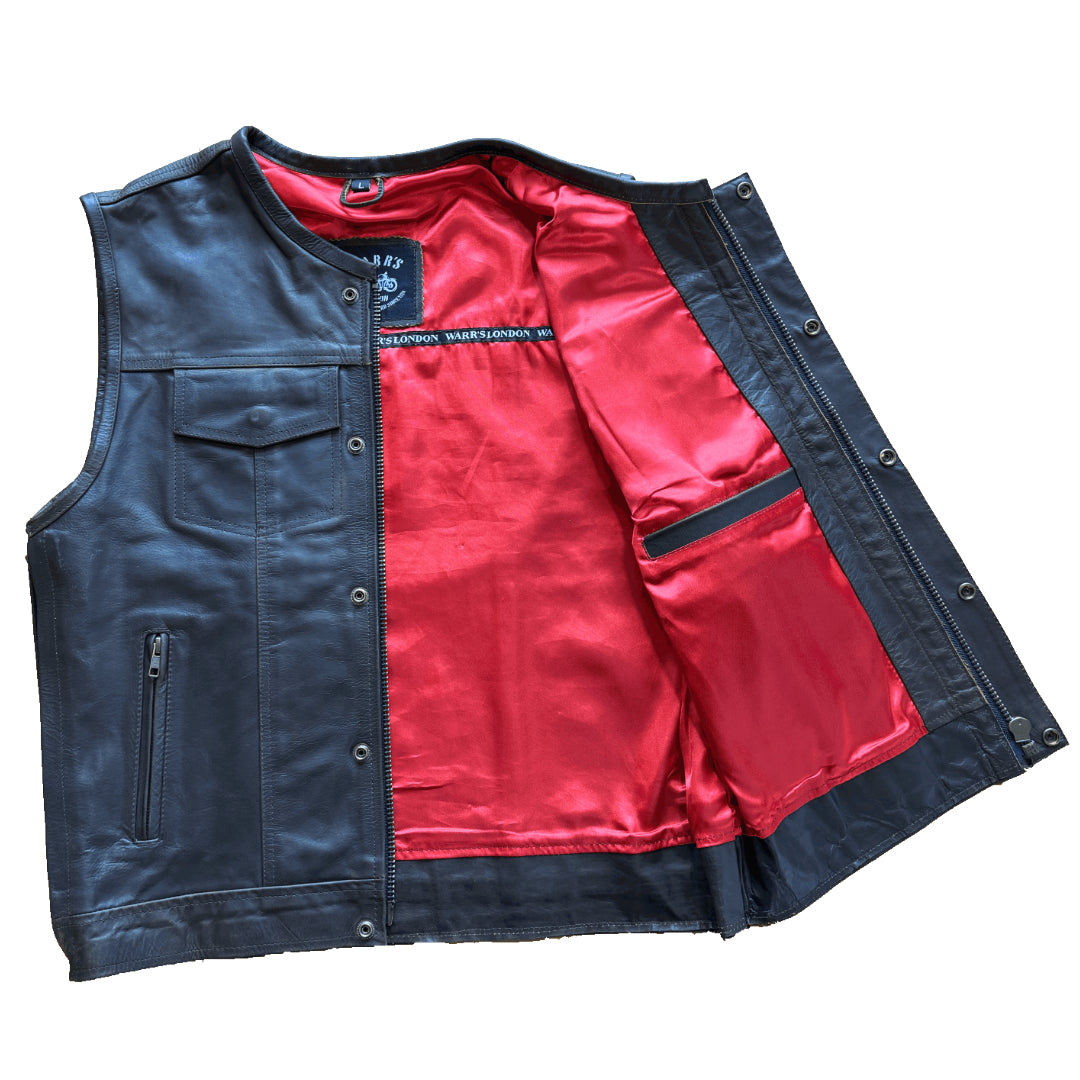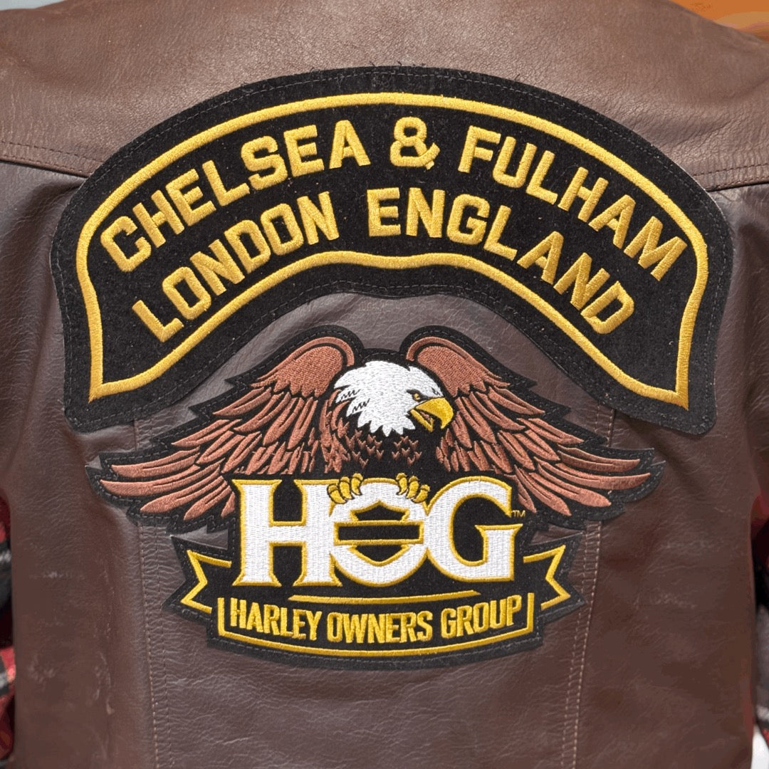 Heavyweight High quality Chelsea and Fulham London Chapter H.O.G Genuine Leather Vest pre-sewn with the new style H-D large back Chapter rocker and Harley Owners Group patch.