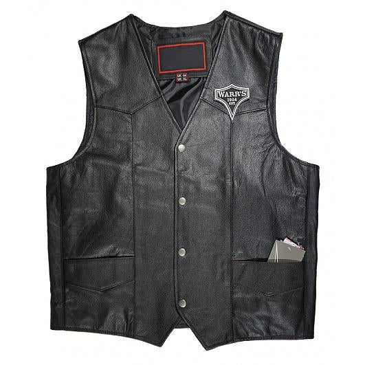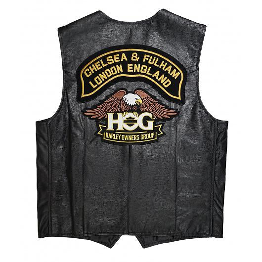 Lightweight High quality Chelsea and Fulham London Chapter H.O.G Genuine Leather Vest pre-sewn with the new style H-D large back Chapter rocker and Harley Owners Group patch.