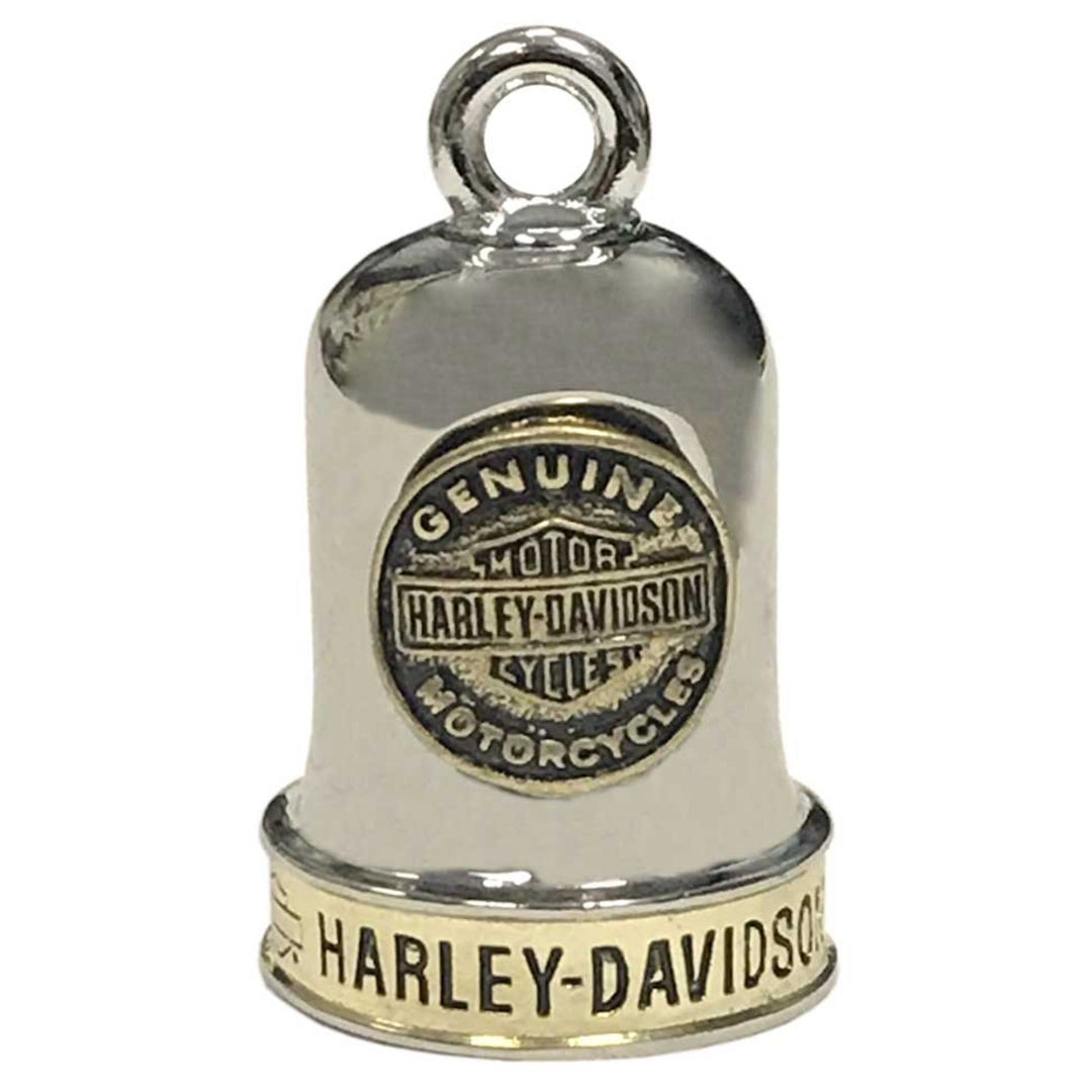 Harley-Davidson® Sculpted Bar & Shield Medallion Ride Bell, HRB095. Time-less Bar & Shield graphic sculpted on both sides. Famous Harley-Davidson® script engraved around bottom. The bell is made out of durable Sterling Silver. Includes ring for hanging.