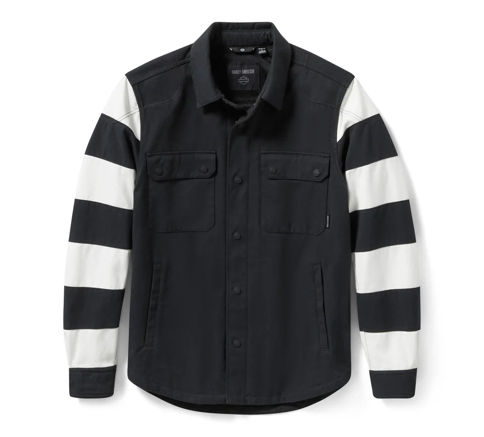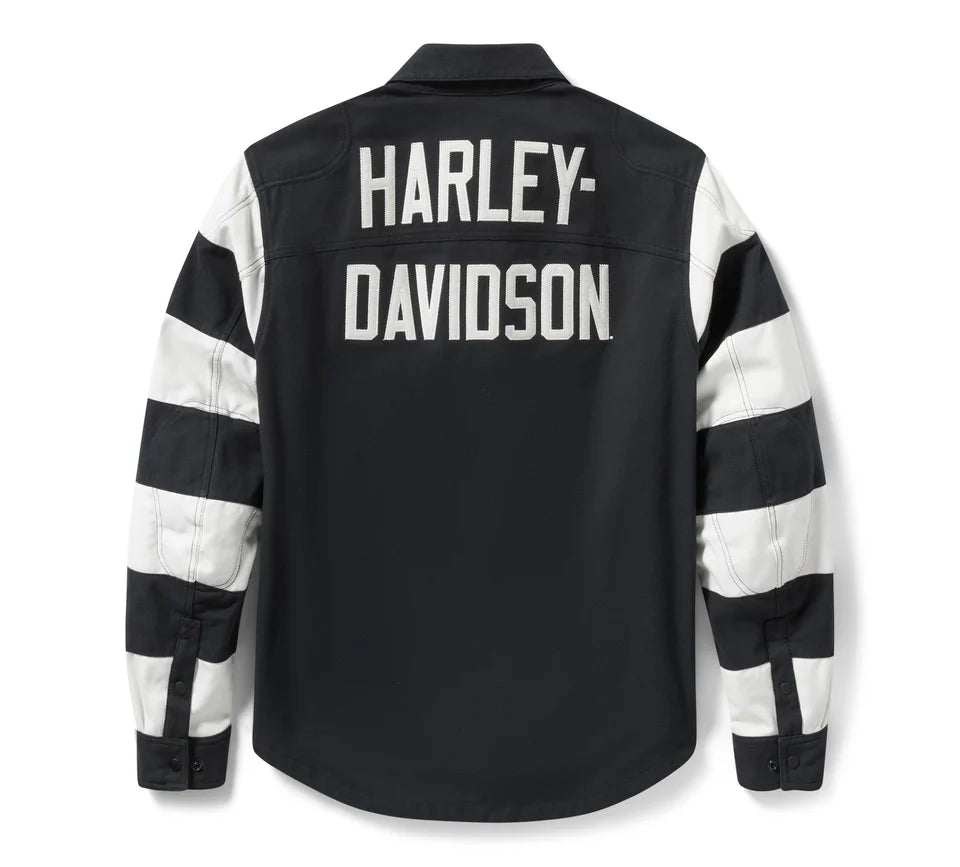 Throwback moto styling synchs with functional riding protection in our latest H-D® Breakout Operative 2.0 Riding Shirt Jacket. Its heavyweight twill blend features a partial lining to feel more like a shirt than a jacket. It has reflective material to enhance visibility, a hidden snap-down collar that won’t flap around during rides, and is equipped with superior impact protection from our D3O® Ghost™ armor at the shoulders and elbows. This men’s motorcycle shirt jacket is also tested and certified to meet abrasion, tear, and seam strength requirements (more details below). It’s finished with sleeve striping and felt patch graphics inspired by our 1920s racing team jerseys. Get familiar with the specs below, then order yours ASAP.