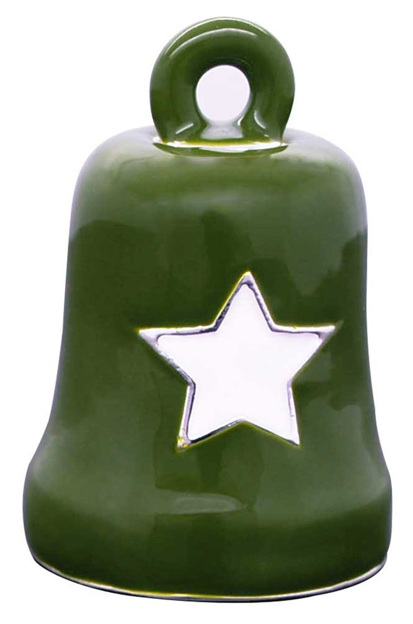 Harley-Davidson® Green & White Star Ride Bell, HRB076. Features a white star design on a green background, military inspired. The bell is made out of durable sterling silver. Includes ring for hanging.