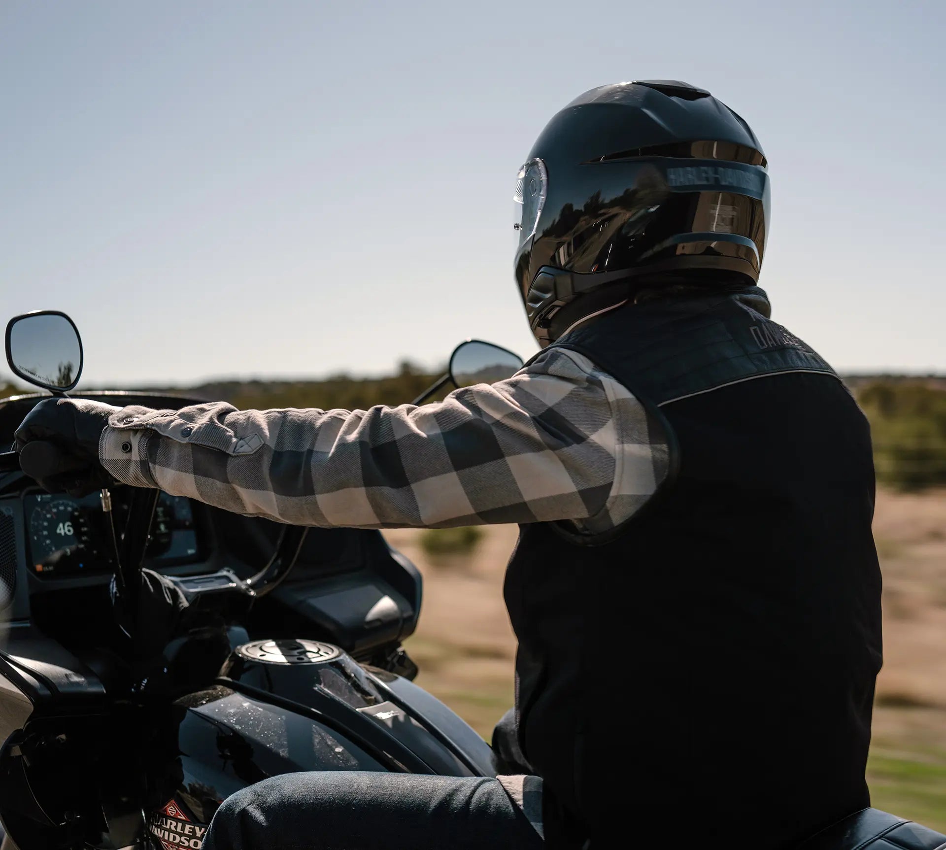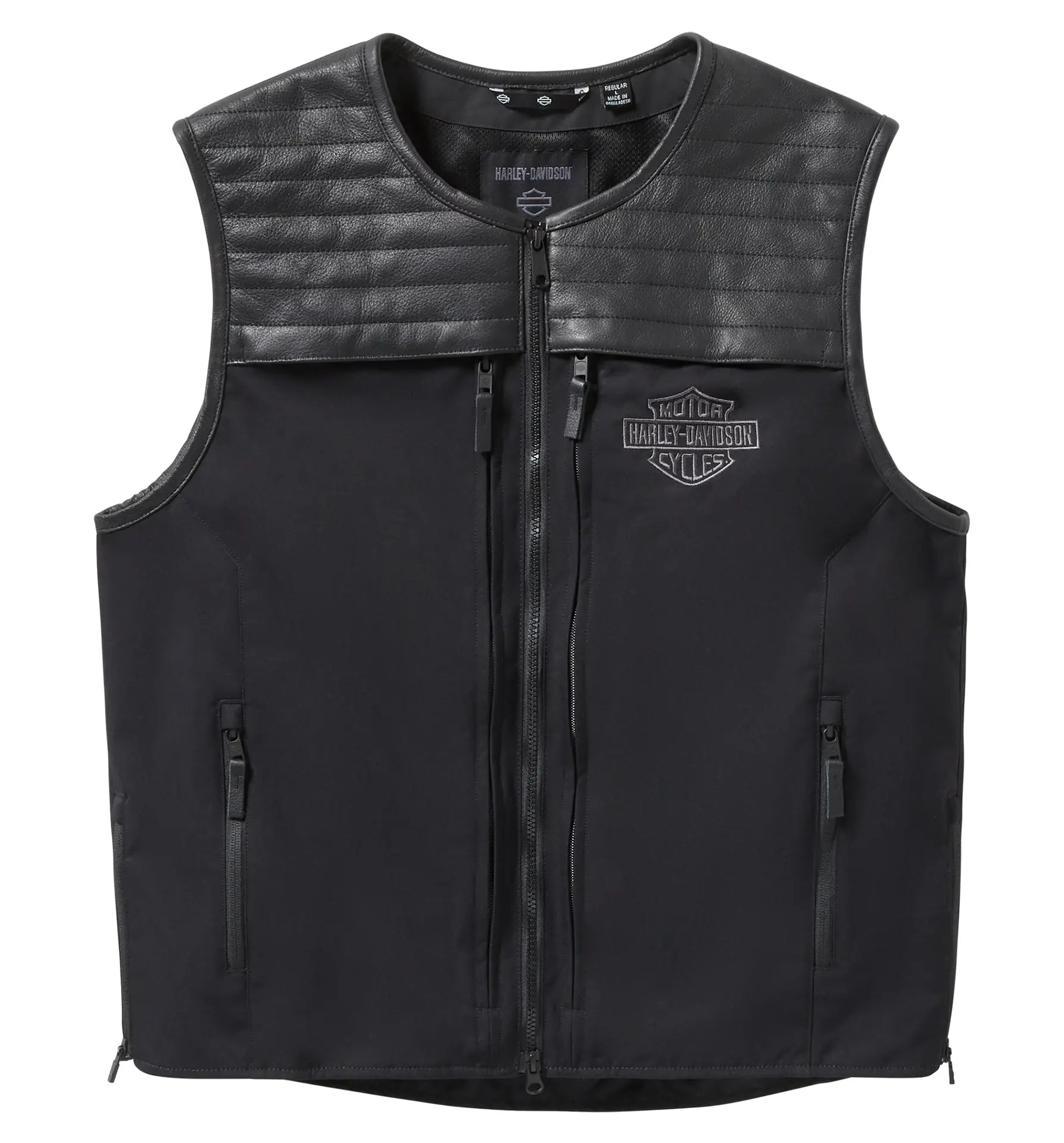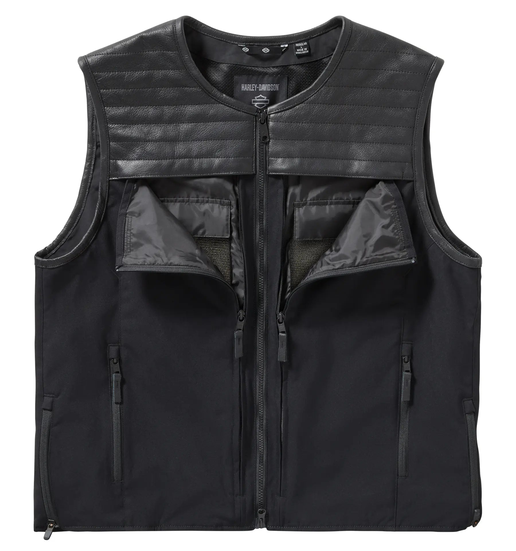 Sensible and stylish coexist on our H-D® Long Haul Utility Vest. Made rugged from a mix of heavyweight nylon and cow leather with a lightweight mesh lining. Its two-way zipper front and leather-bound crew neck make it an easy, comfortable wear. This mens vest also has reflective piping for enhanced visibility and zippered waist seams. But its biggest asset is storage - the whole front body has concealed, zip-closed pockets to organize your essentials, plus zippered hand and interior pockets for stashing more stuff. Branded with a hit of embroidery on the front and back for a more lowkey yet timeless Harley look.