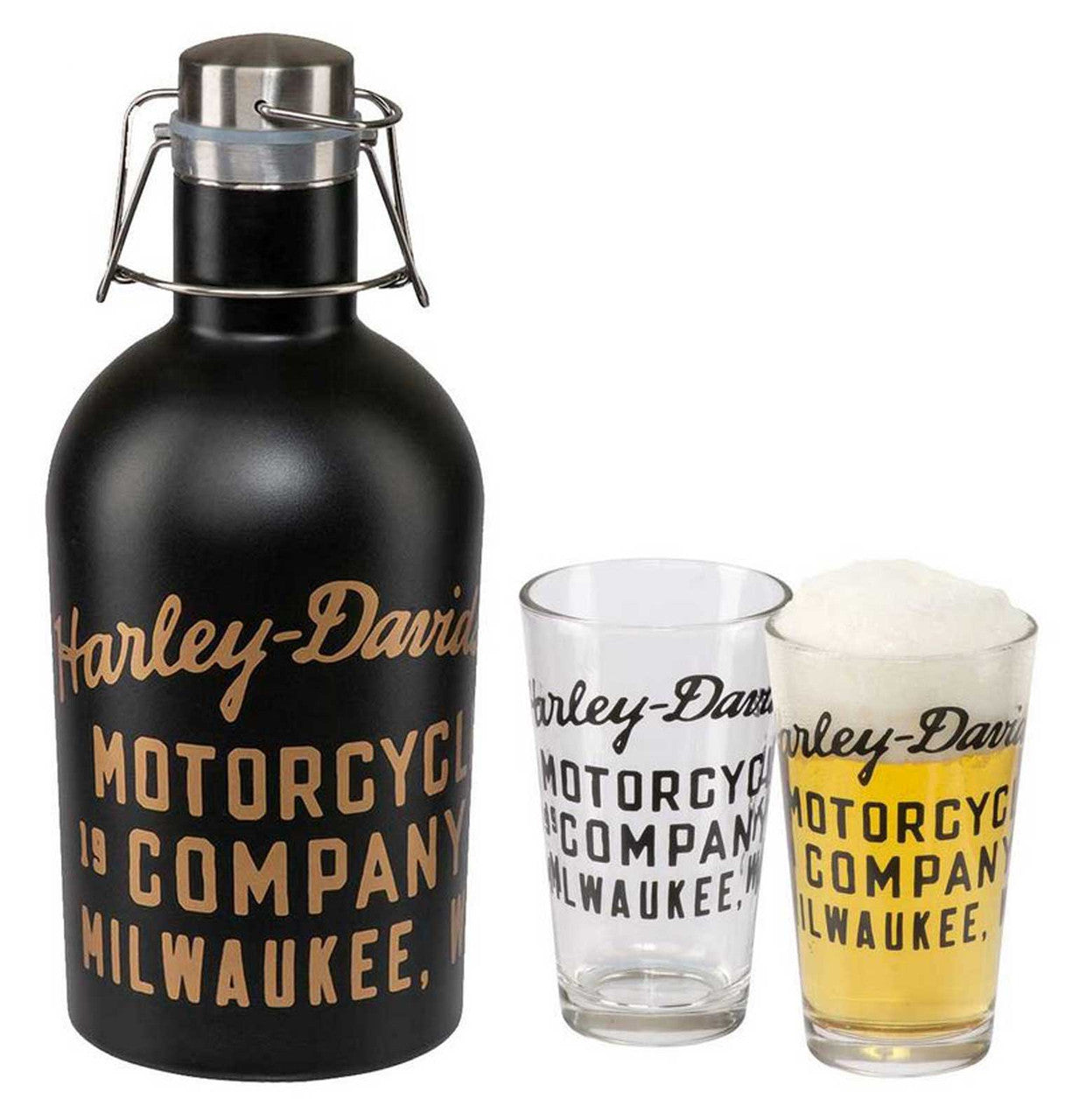 Harley-Davidson® Stainless Steel Growler Gift Set - Black, HDX-98732. Set includes 50 oz. Stainless Steel Growler with sealed cap and two 16 oz. pint glasses with H-D Motorcycles Company logo. Hand wash only. Made from Stainless Steel 50 oz. Growler with sealed cap Includes two 16 oz. pint glasses H-D Motorcycles Company logo Hand Wash Only Manufacturer Part Number: HDX-98732 661154987328