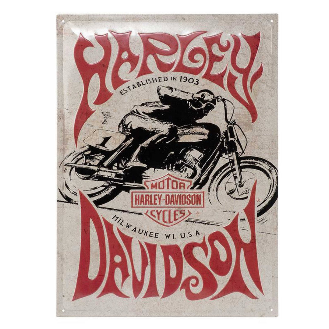 Harley-Davidson® 1970s Racer Tin Sign, HDL-15564. Custom tin sign with arched center and embossed vintage 1970s H-D Racer graphic. Dimensions: 12" W x 15.75" H.