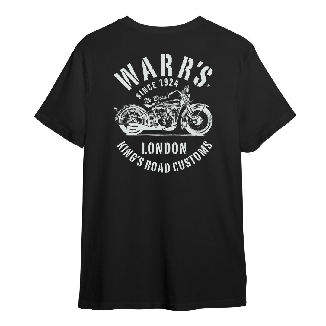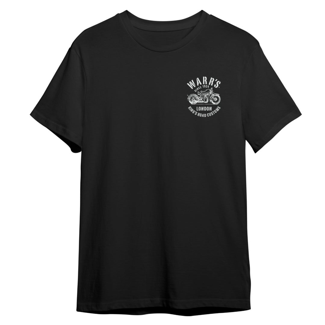 New for 2025 Warr's H-D Kings Road Customs T-Shirt in Reverse, small logo on front pocket and large logo on the back black cotton.
