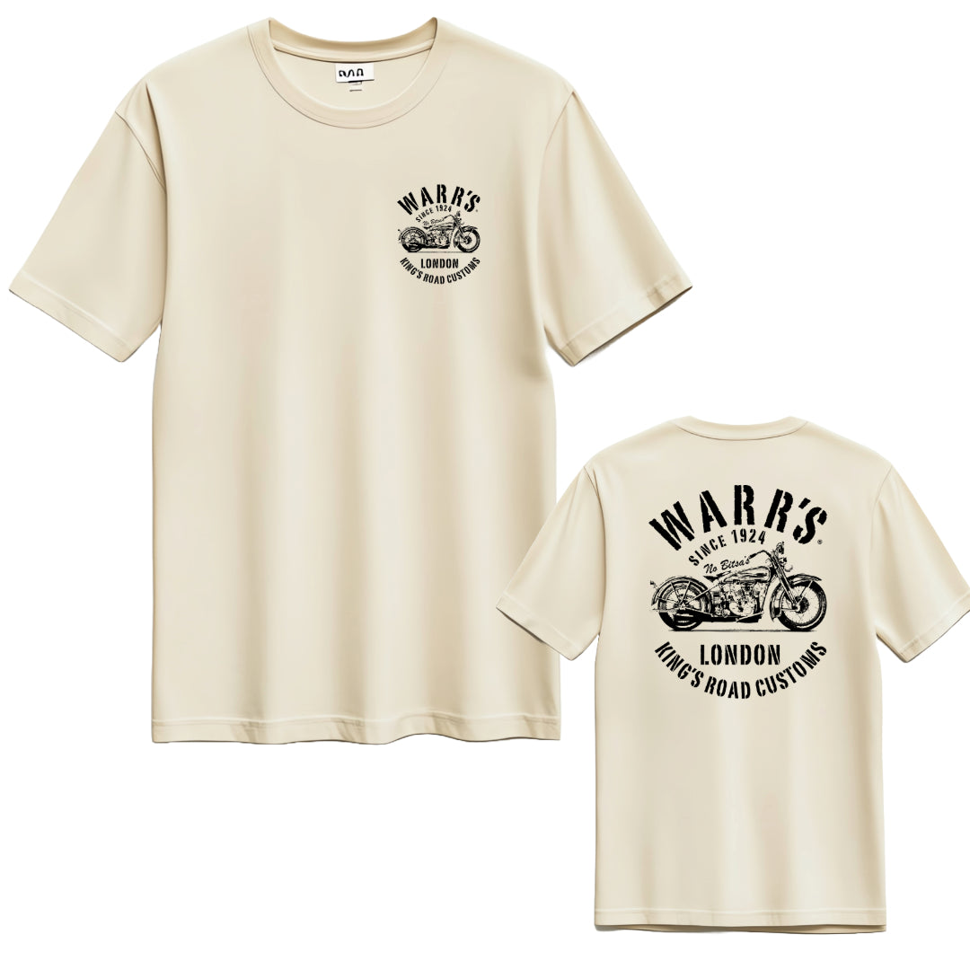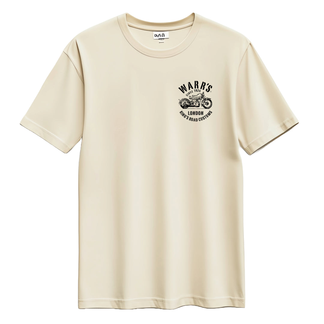 New for 2025 Warr's H-D Kings Road Customs T-Shirt in Reverse, small logo on front pocket and large logo on the back Cream cotton.