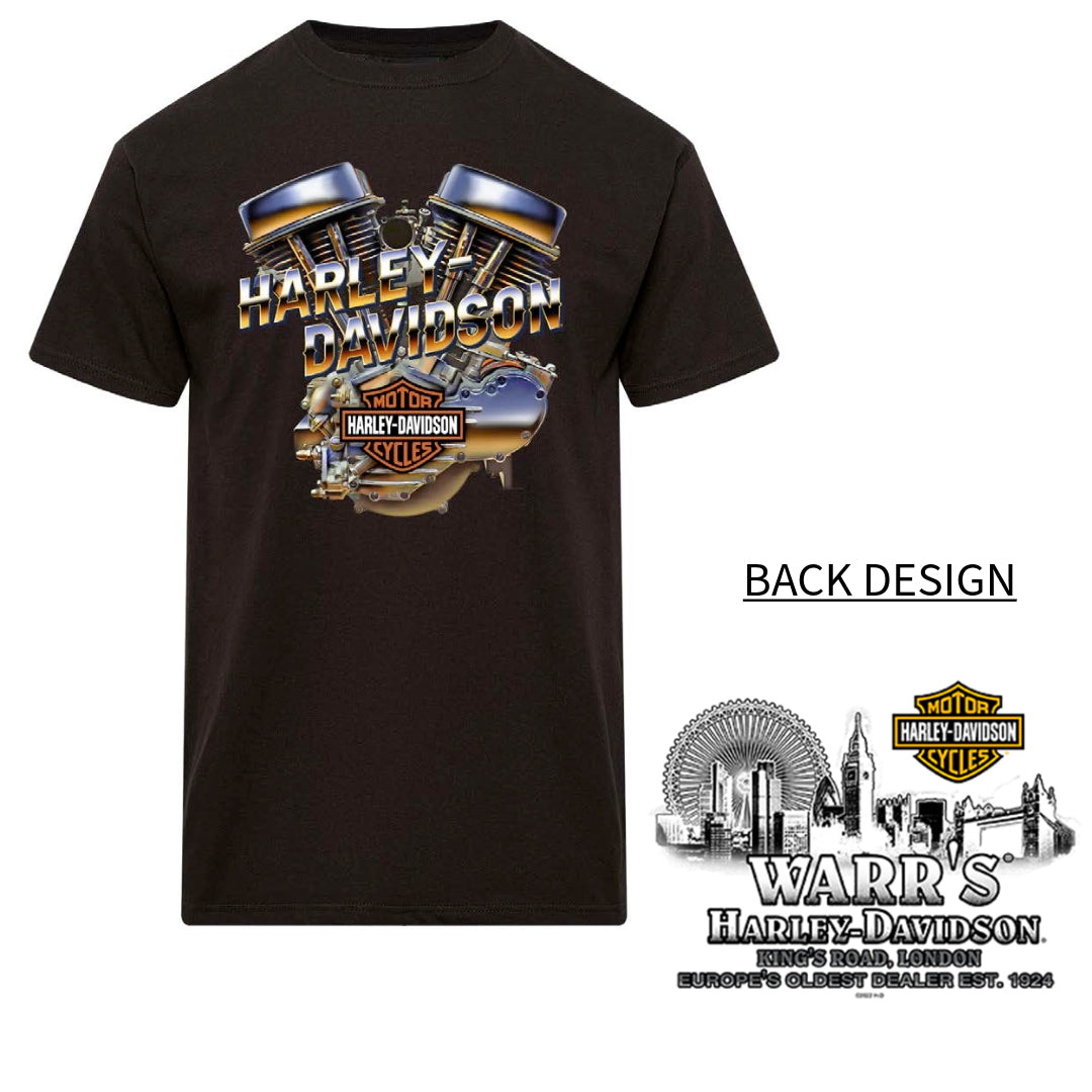 Genuine Harley-Davidson Men's T-Shirt featuring the "Rumble " design on the front and "London At Night - Europe's Oldest Harley Dealership - Since 1924" London dealer design on the back.